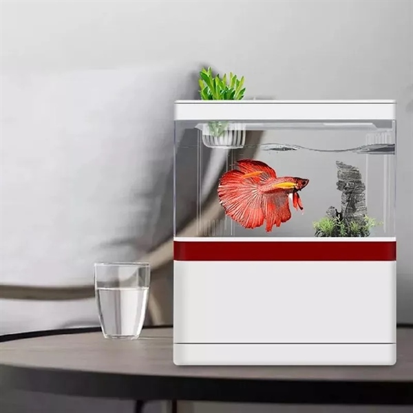 Bể Cá Mini Fish Tank có kích thước nhỏ phù hợp để bàn làm việc. Bể được tích hợp sẵn đèn và bộ lọc, chỉ cần đổ nước vào và cắm điện là có thể sử dụng được. Ngoài ra với thiết kế độc đáo có giá đỡ điện thoại phía dưới giúp bạn vừa có thể sạc điện thoại, xem video mà vẫn ngắm được cá.